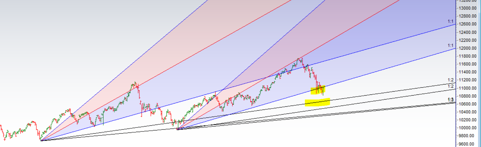- As Discussed in Last Analysis Bearish case worked perfectly and below is my analysis on Facebook during market hours we discussed 10850 i strong support low made was 10850.40 and we rallied 100 points in 10 Mins. Now Bulls need to close above 10944 for a move back to 11030/ 11089/11149. Bearish below 10850 for a move back to 10800/10730/10666. Nifty is bouncing again from the support zone of 10850-10870 our price time squaring level,suggesting its strong support, also closed above last quarterly level of 10930 suggesting we are trying to form bottom. ANy break of 10850 can see fast move towards 10800/10730. Nifty bears got whipsawed below 10850 Bulls once above 10944 did a fast rally till 11030. Till we are holding 10944 we should rally towards 11089/11149. Beareish below 10920 for a move back to 10870/10820. Today 03 Oct is important trend change date. Important intraday time for reversal can be at 11:33/2:40. Bank Nifty continue to Hold Gann Angle, EOD Analysis