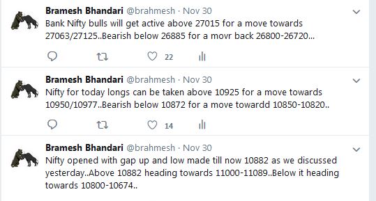- As Discussed in Last Analysis We got the big move as we anticipated and nifty did our target so time cycle again worked perfectly and we were able to capture a 282 points from low of 26 Dec our time cycle date till today. Now Bulls need a close above 10885 for the rally to continue till 10944/11000/11100. Bears will get active below 10840 for a move back to 1777/10721. Nifty bulls got stopped out above 10885 and bears also not able to close below 10840 and also unable to break gann angle as shown below. Bulls will get active above 10882 for a move towards 10930/11000/11100. Bears will get active below 10800 for a move back to 10721/10666. 02 Dec is important time cycle date so effect will be seen on 03 Dec. We also updated our level on Twitter and they achieved the target as mentioned. Important intraday time for reversal can be at 12:12/2:05. Bank Nifty Bulls fails to close above 27000,EOD Analysis