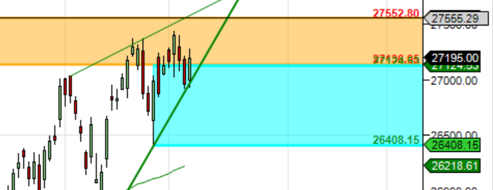 Bullish above 27225 for a move towards 27340/27532 Bearish below 26920 for a move back to 26784/26666/26500/26225