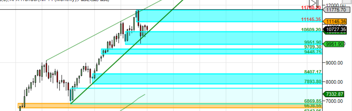 Monthly Trend line Support at 10610 break of that can see fall towards 10400/10000-9951. Upper End Support comes at 11145/11760