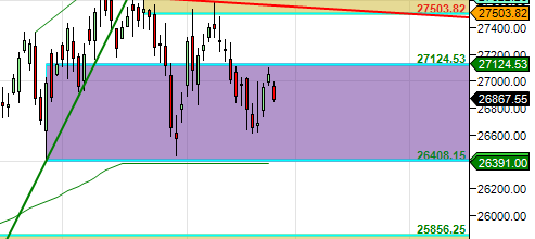 Bulls need to close above 26920 for a move back to 27000/27225/27350. Bears will get active below 26800 for a move back to 26666/26500/26250.