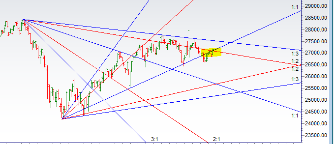 - As Discussed in Last Analysis Now Till we are below 26920 bears have upper hand and can push towards 26800/26721/26610. BUlls will become active above 27000 for a move back to 27072/27150/27225.25 Feb is important time cycle date. Everything went as planned today as we saw big move on time cycle date once above 27000 bulls had upperhand and pushed bank nifty towards 2 target, and also closed above gann angle. Now waiting for higher target of 27360/27496. Bears have chance below 26990 for a move back to 26920/26810.
