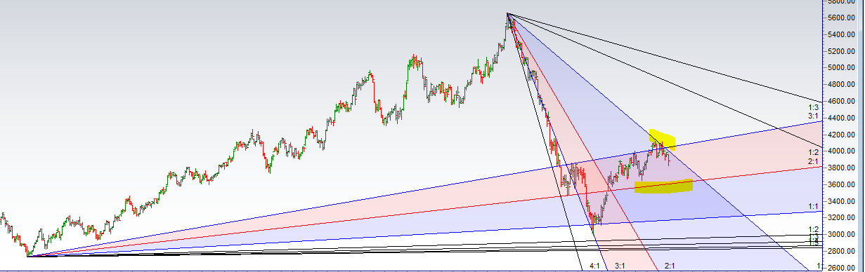 4001 played a crucial role as once we went above it in coming week and did our 1 target of 4050 and once below 4001 we did 3 target on downside till 3843 so excellent week for crude traders.We again reacted from gann angle resistance zone. Also 06 March played a crucial turning date as High of 3977 not crossed on 08 March and we tanked 150 points from that level.