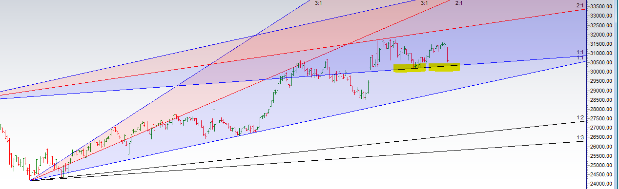 - As Discussed in Last Analysis Fresh long should be taken above 31660 for a move towards 31784/31964/32054. Shorts should be taken below 31305 for a move towards 31216/31128/31040/30952. Shorts did the target on downside,Neural Analysis worked perfectly and we saw big fall on 08 Jul and once below 31000 had a big fall. Now Bulls have strong support in range of 30384-30400 based on gann angles as shown in below gann angle chart. Fresh Short should be taken below 30377 for a move back to 30150/30000. Long should be take above 30672 for a move back to 30816/30960/31104.