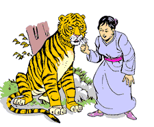 The next day before dawn, she crept out of the house with a bowl of rice covered with meat sauce. She went to a cave on the mountainside where a tiger was known to live. She clicked her tongue very softly as she crept up, her heart pounding, and carefully set the bowl on the grass. Then, trying to make as little noise as she could, she backed away.