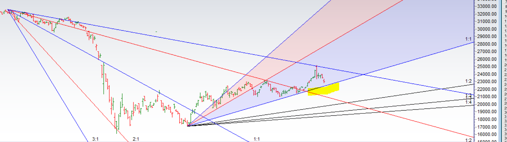 • As discussed in last analysis Bulls got whipsawed and bears did 23596 on downside and now waitng for 23317/23150/22900/22700. Bulls will get active above 23751 for a move back to 23904/24278/24500. Bank Nifty made top at Gann Angle as shown in below chart and we have corrected around 1500 points in 5 trading sessions. 22900 done and now we are heading towards 22610/22419/22100 till we are below 23200 levels. Bulls will get active above 23333 for a move back to 23500/23666/23829.