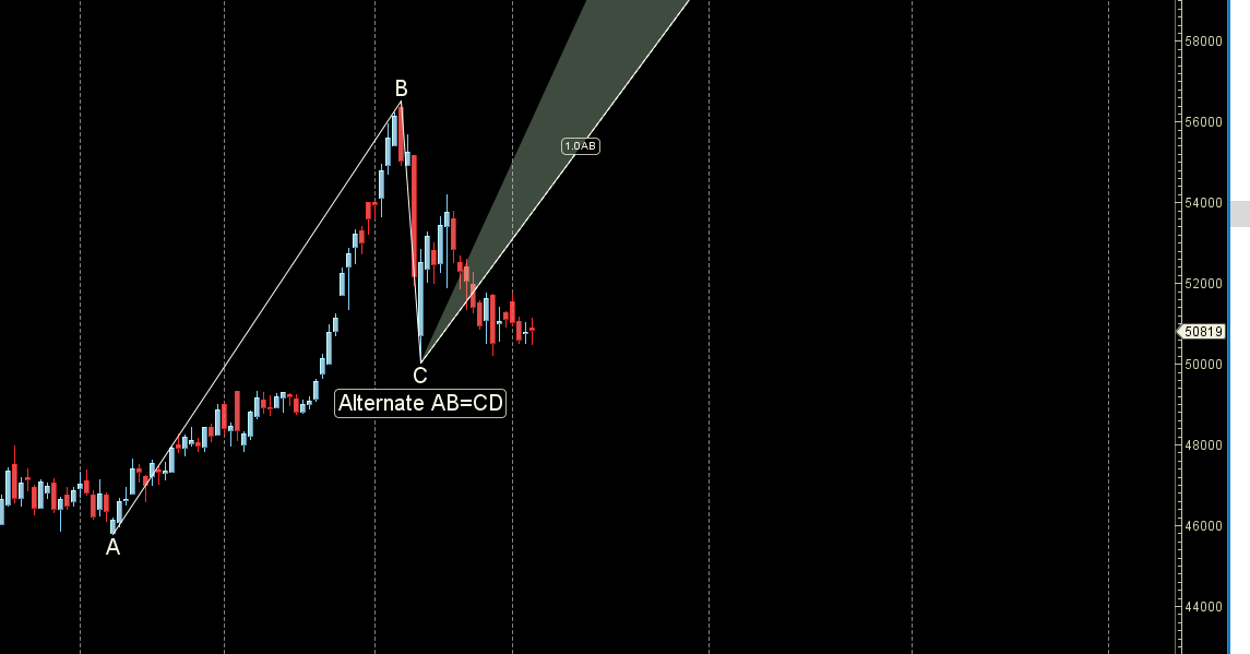 Price coming  near 50000 can be a good entry for long trade as per harmonic pattern,Low made last week was 50362.
