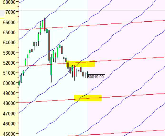 Sun Planneatry line is acting as a resistance,Bulls need to hold 50000 for another attempt towards Sun Planneatry line