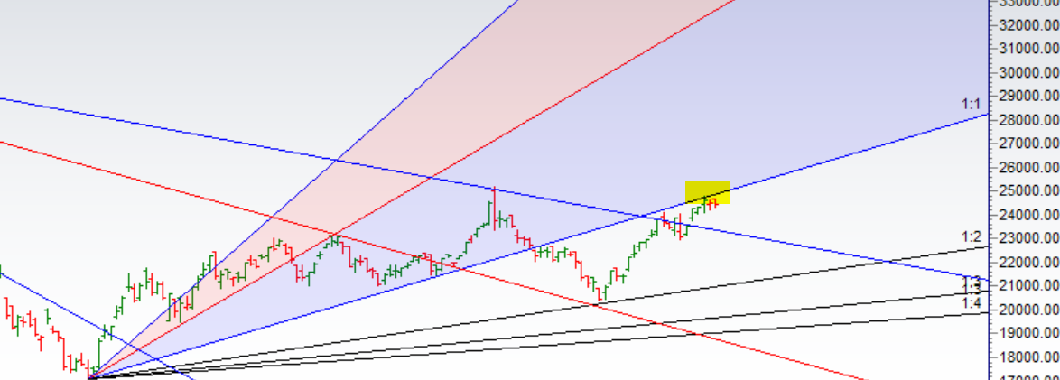 • As Discussed in Last Analysis Bank Nifty has formed Inside Bar,unable to cross gann angle resistance, today was Sun Ingress suggesting good move should be seen in next 2 trading sessions. Bulls need to move above 24700 for a move back to 24850/24964/25281. Bears will get active below 24250 for a move back to 24050/23820/23666. Bulls were not able to sustain and close above 24691  Sun Ingress High, Based on Time cycle we should see good move on Monday. Bulls now need to move above 24600 for a move back to 24764/24920/25111. Bears will get active below 24350 for a move back to 24250/24131/23900..
