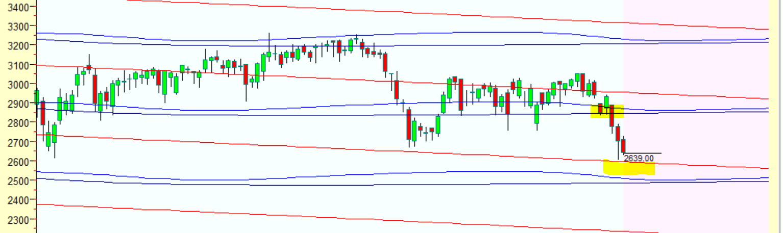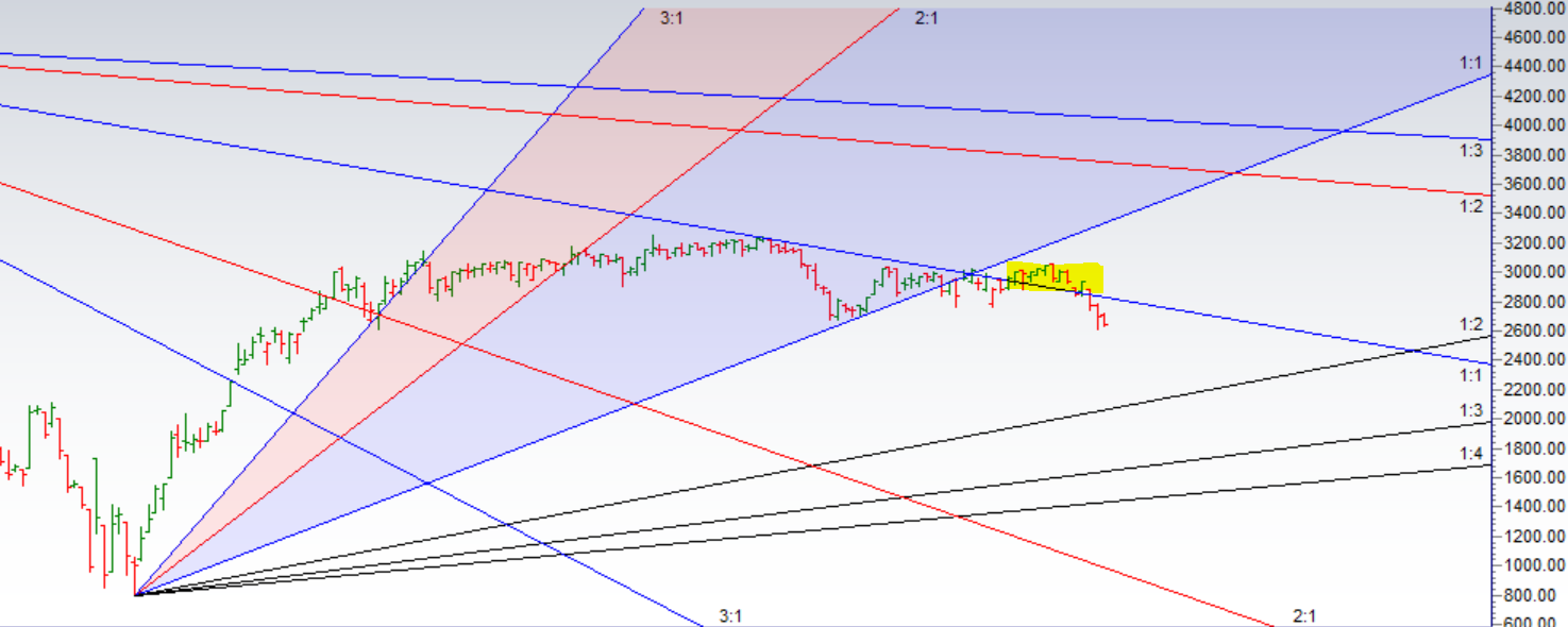 As Disccused in Last Analysis Price has broken below the gann angles so price below 2925 heading towards 2890/2850/2801/2743. All Target on downside. Now Break of 2600 can see price falling towards 2555/2500/2450. Above 2684 Bulls can secome back towards 2720/2774.