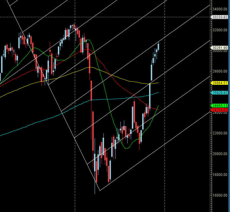 Monthly candle need to go above 30900 for a move back to 31317/31822. Bears below 30099 has upper hand till 29594/29238.