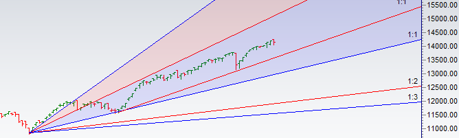 • As discussed in Last Analysis  Another gap up open but unable to sustain above cluster of gann resistance 14250-14256 ,Gann Angle resistance As we have weekly expiry tommrow, bulls need to move above 14201 for a move back to 14250/14323. Nifty again failed to close above the gann resistance of 14250-14256 high made was 14254 and tunred back. Tommrow is an important date as per gann analysis as on 08 Jan 2008 we made the Top of 6357 so we are completing 13 years from that top.Bears below 14112 can see a quick fall towards 14060/13968/13924. Bulls need to move above 14192 for a move back to 14256/14305.