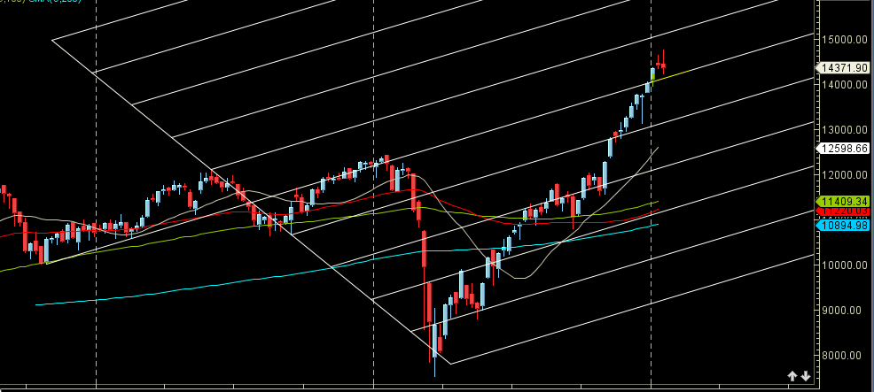 Price in middler of 2 gann angle can see decline towards 14065 on break of 14350.