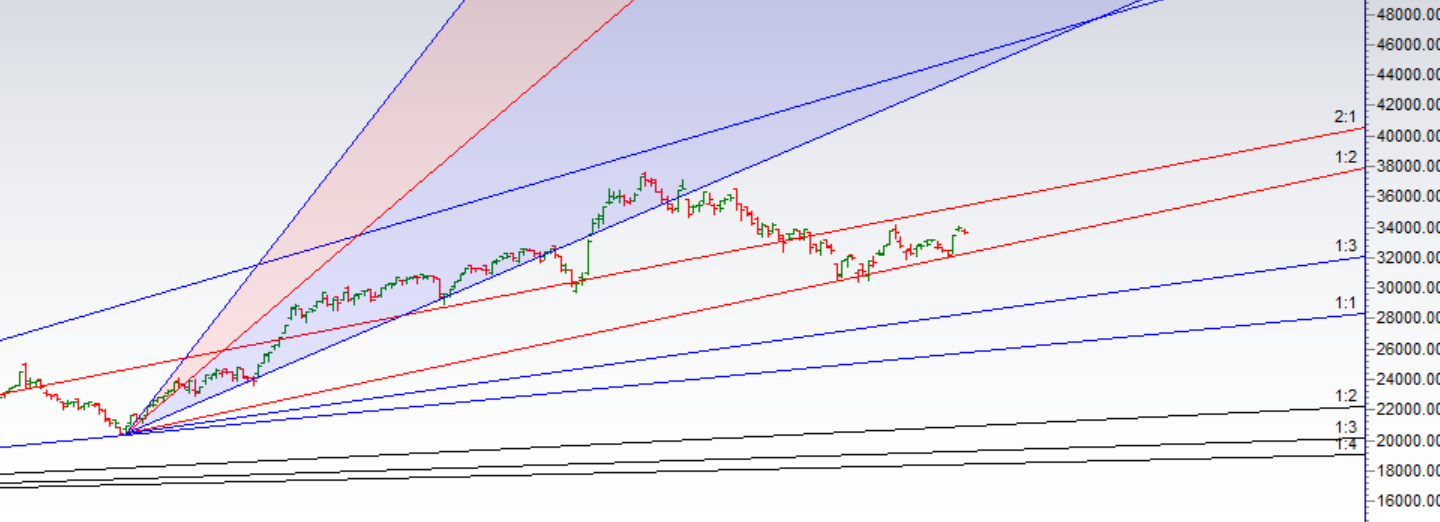 • As Discussed in Last Analysis  Bank Nifty opened with a gap up formed DOJI, Now we are at a crucial juncture and can see potential price time squaring tommrow based on Gann if we do another close below 34057. Bulls need a close above 34057 for a move back to 34343/34545/34729. Bears will get active below 33720 for a move back to 33520/33308/33040. Bank Nifty bears were able to close below 34057 now waiting for the target of 33520/33308/33040 as per gann price time squaring,Bulls need a close above 34057 for a move back to 34343/34545/34729.