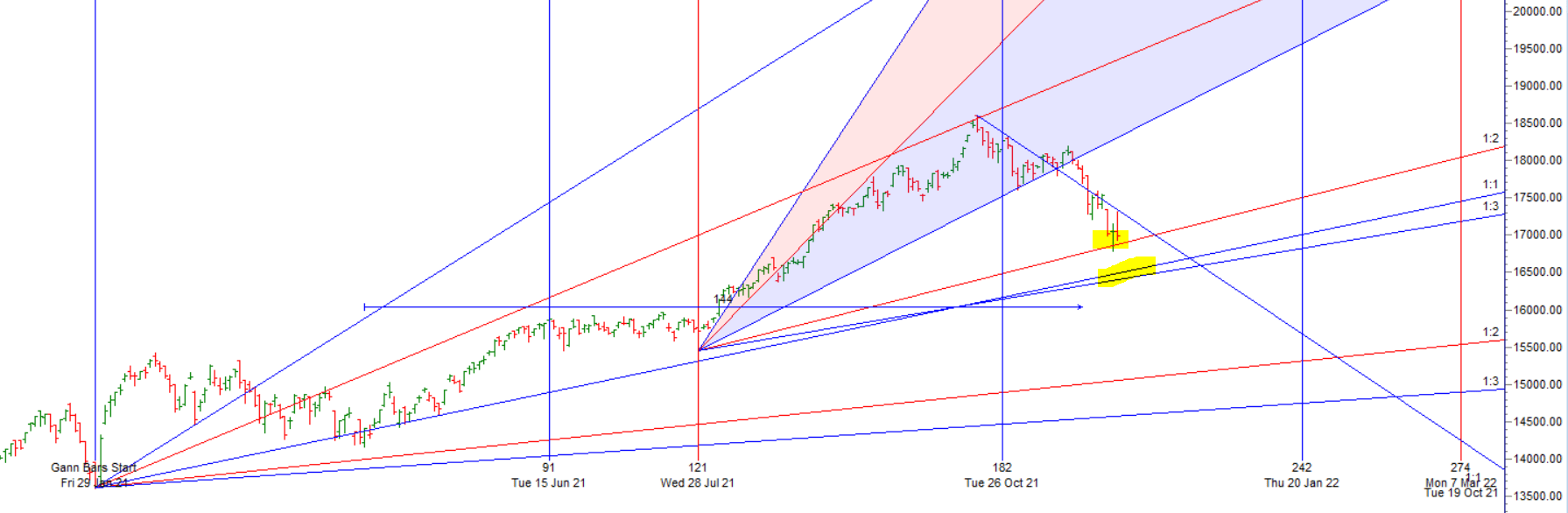 • As Discussed in Last Analysis  Have we made bottom as discussed in below video  its will be confirmed when we have a close above 17171 in next 2 trading session as we have formed doji at gann angle. Bulls need to move above 17173 for a move towards 17238/17304/17370. Bears need a close below 16977 for a move back to 16912/16847/16782. 2 Bullish target done above 17171, As Mentioned in Video Mars creates the voaltality and we saw today price correcting from the top and closing below 100 DMA. Gann Angle again acted as resistance. Now Bulls need to move above 17041 can see quick move towards17106/17171/17235. Bears will get active below 16911 for a move towards 16847/16782