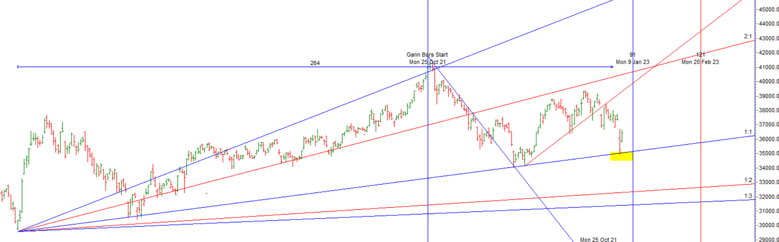 As discussed in Last Analysis We opened with Huge gap down and saw deep cut in Bank Nifty tune of 2163 points and we are back to gann 1×1 line support. Fall can extend more as bank nifty closed below its 200 DMA, Bears need to move below 34990 for a move towards 34790/34418/34048. Bulls will have chance above 35540 for a move back to 35729/35918/36200. Gap Up open as Price took support at 1×1 line and rallied big time. We have many astro event happening in weekend but most important is Venus Trine North Node Mars Trine North Node. Mars and Venus Aspect with Rahu it will create lot of voaltlity and wild swing so trade with less position size.First 15 mins High and Low will decide the trend for the day. For Swing Traders Bank Nifty need a clos above 36639 for a move towards 37032/37191/37452 Bears will get active below 36246 for a move towards 36000/35500/35000.