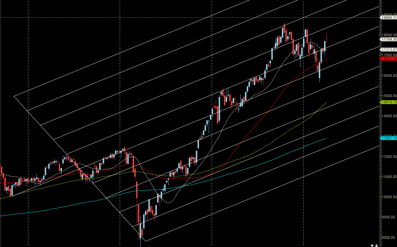 Bulls need hold 17576 for a move towards 17828/17956. Bears below 17500 for a move towards 17225/17040.