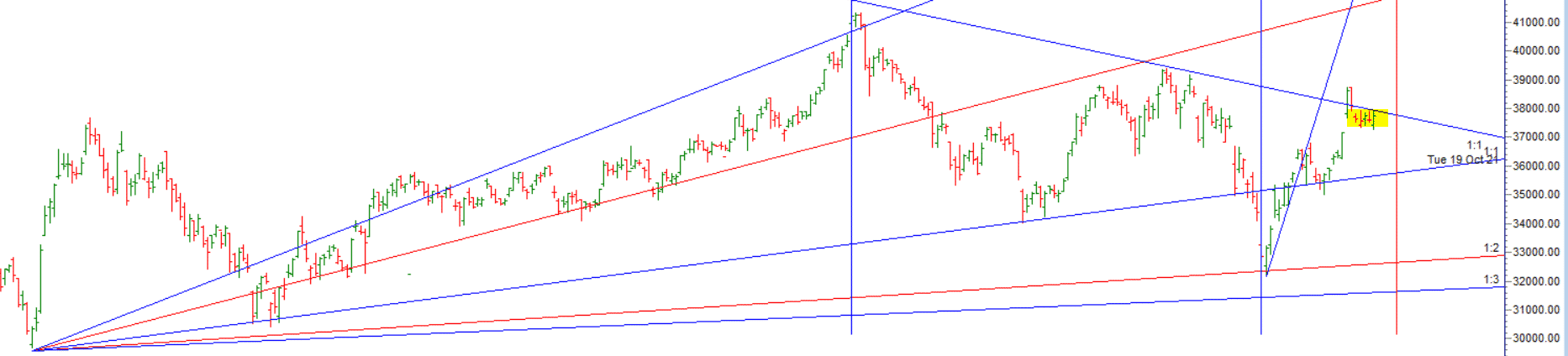 As discussed ib Last Analysis For Swing Traders Bulls need to move above 37733 for a move towards 37926/38119/38313. Bears will have chance below 37540 for a move towards 37346/37162/36967. We should see big move in bank nifty in next 2 trading session as we have been approaching gann angle and astro date. Bears were able to do 1 target on downside and 1 on upside, Tommrow we will have Bayer Rule 27: Big tops and big major bottoms are when Mercury’s speed in Geocentric longitude is 59 minutes or 1 degree 58 minutes. so first 15 mins high and low will decided the trend of the day. We are back to gann angle resistance zone as shown below more we touch resistance zone it will break, For Swing Traders Bulls need to move above 37843 for a move towards 38036/38229/38422. Bears will have chance below 37650 for a move towards 37457/37264/37008. Also tommrow is last trading day as next 2 days are trading holidays.