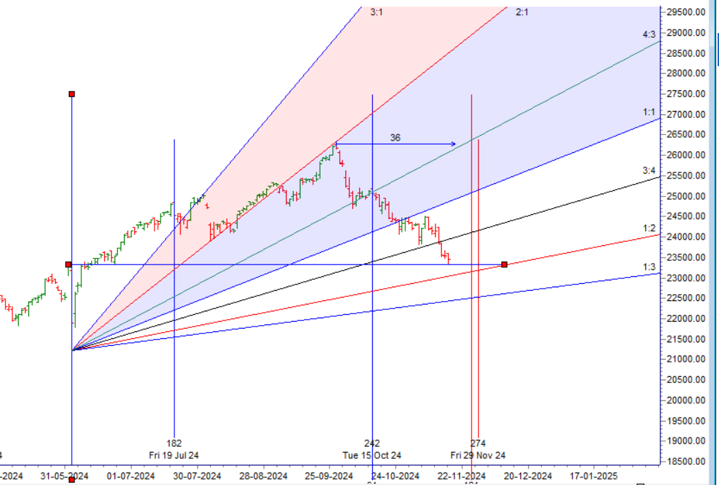 Nifty experienced a waterfall decline today, with the price breaking below 23,777 and closing well below that level, finding support at 23,514 near its 200 DMA. We also observed the impact of the astro cycle as discussed in the video below. The price has broken below the 3×4 Gann angle and is now heading towards the 1×2 angle around 23,200.