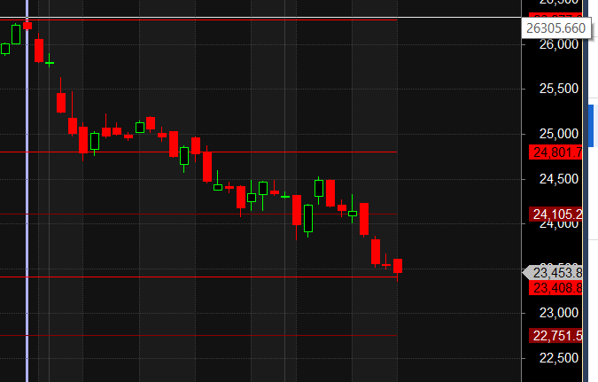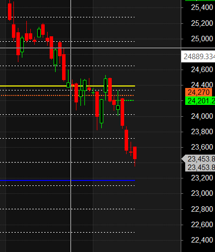 Tomorrow, we have the weekly close (as Friday is a trading holiday), marking the 7th week of decline. The second half of tomorrow’s session is crucial, as it could lead to short covering if the price holds above 23,512.