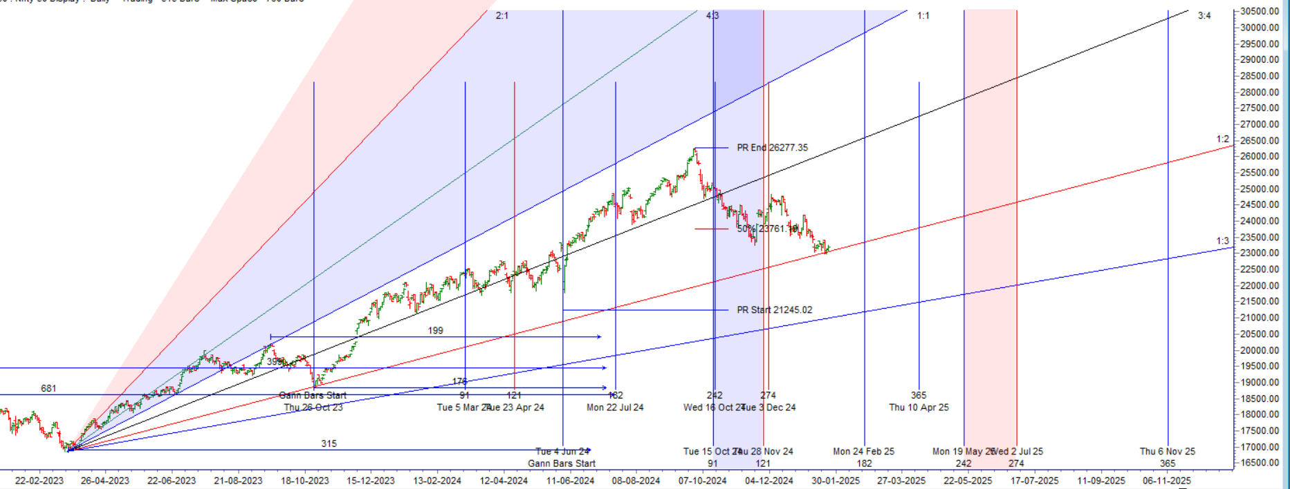 Nifty saw a bounce back from the 22,976–22,981 range, which aligns with the Gann angle support zone. However, it continues to face resistance at the 23,170–23,200 zone, a critical Gann resistance level and the Sun Ingress low.
