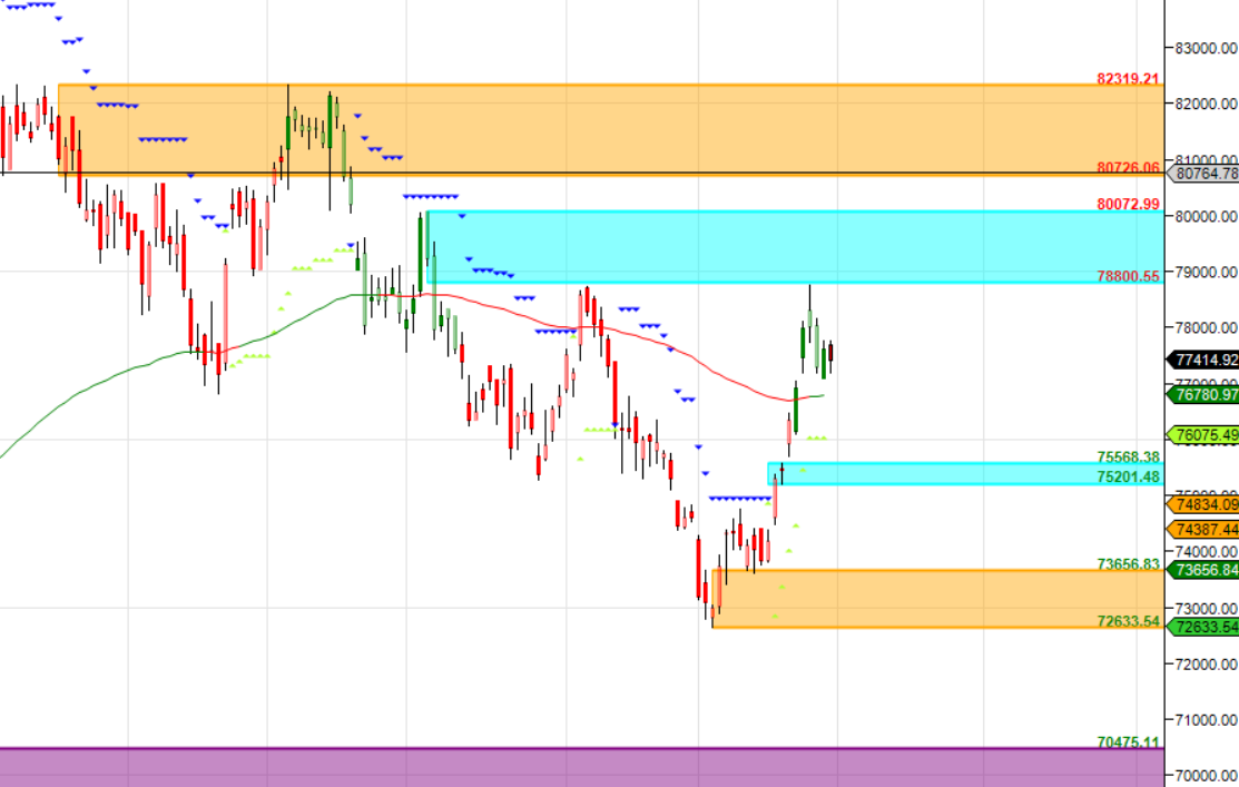 78500 is Monthly resistance zone 76908 is Support zone.