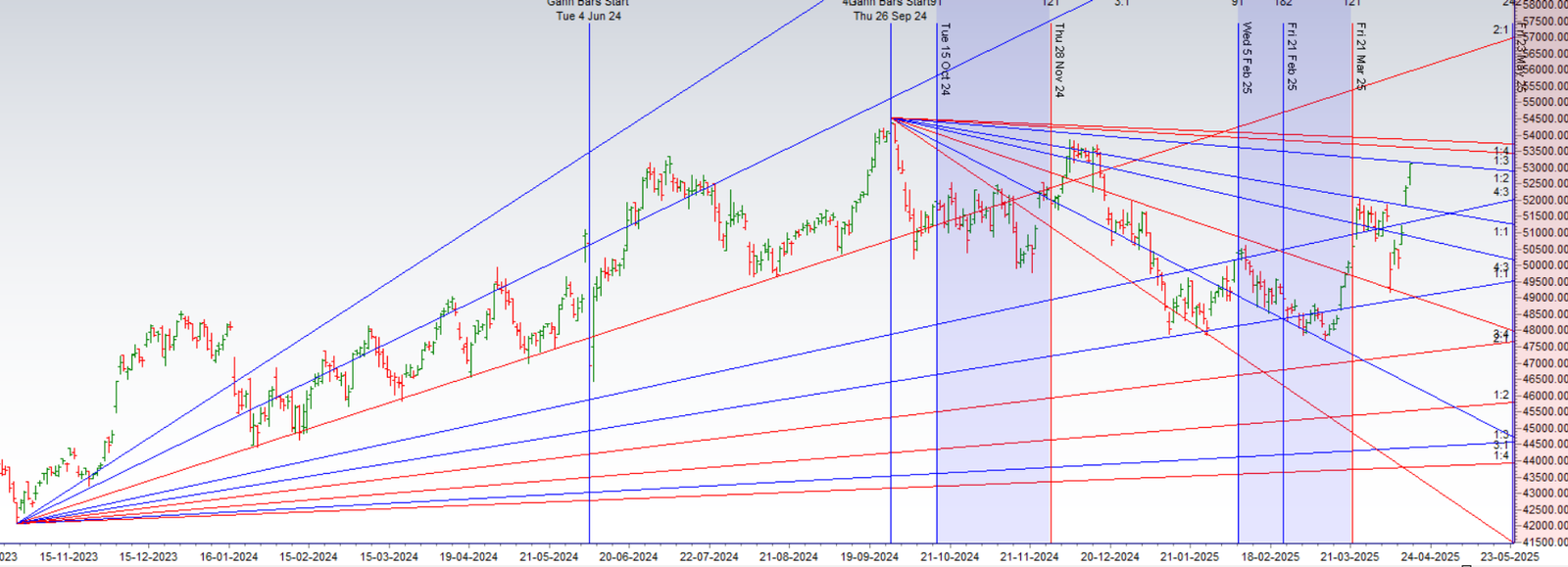 Gann Yearly Trend Change Level: 52,348 → Bulls need to sustain above this to unlock higher targets.