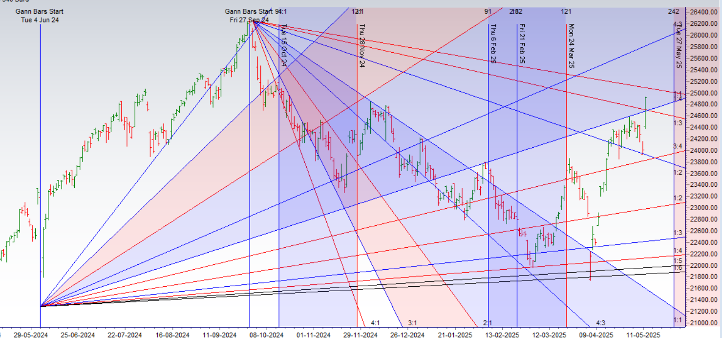 Nifty took precise support at the 23,900–23,935 zone, which aligns with a critical Gann angle. Additionally, May 11 marks a powerful confluence of time cycles:
