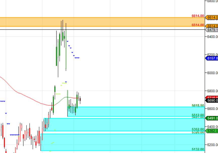 Price has bounced from Shark Pattern PRZ zone heading towards 5900 till holding 5500.