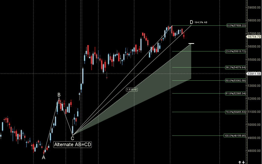 Bank Nifty has reacted from its PRZ zone of 57500 Unable to cross fall towards 55600.