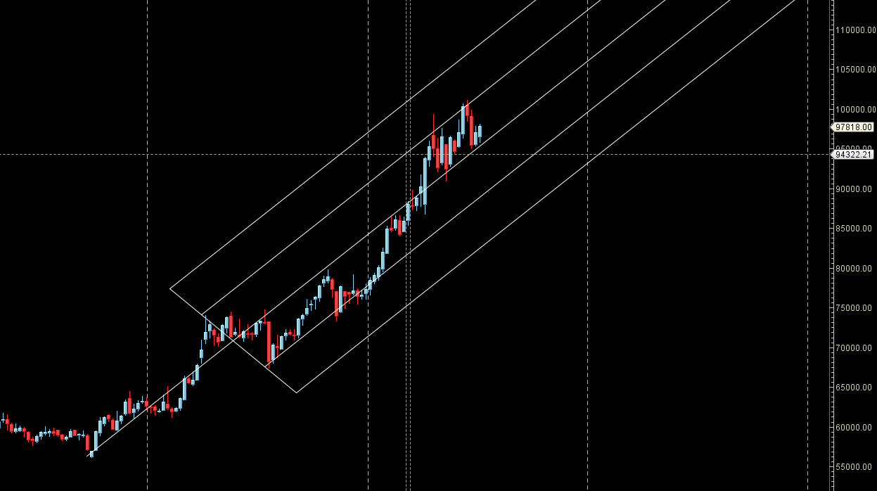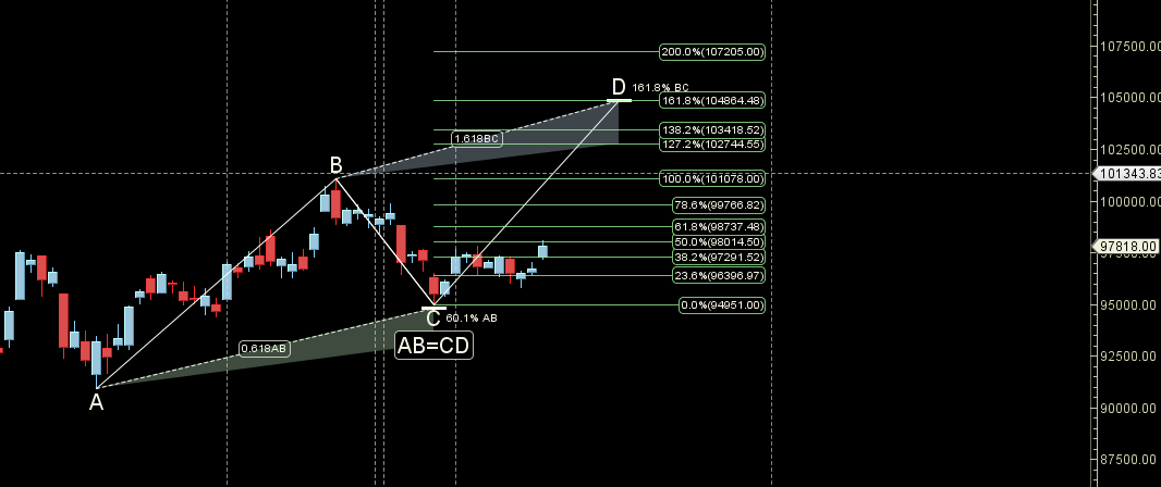 Price has reacted from its C Leg of AB=CD heading towards 99000-99500.
