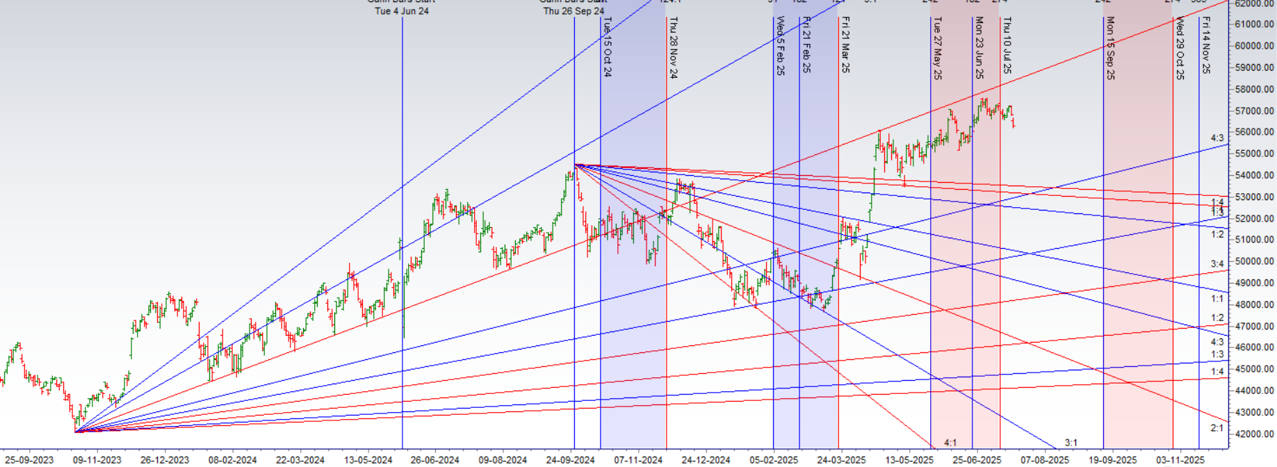 The Bank Nifty is balanced on a razor’s edge. The bears have won a decisive technical victory, shattering the Saturn low and the 50% retracement level. Their path is now clear towards lower targets as long as the market stays below the 56594 resistance.
