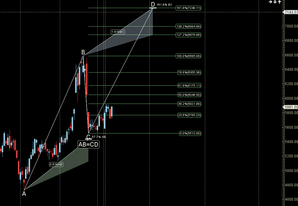 Price has bounced from Shark Pattern PRZ zone heading towards 6000 till holding 5700.