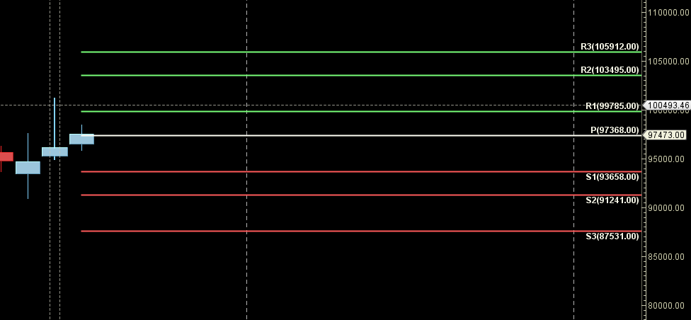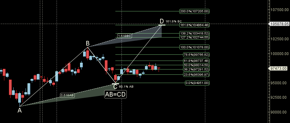 Price has reacted from its C Leg of AB=CD heading towards 99000-99500.