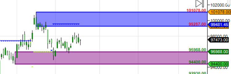 MCX GOLD Supply Demand Chart : Demand in range of 96000-95900 , Supply in range of 99000-99287