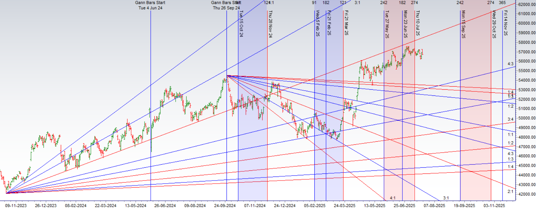 The Gann Monthly TC Level at 57210: This level, derived from W.D. Gann’s complex time and price analysis, represents a major monthly point of resistance. Such levels are historically very difficult to breach on the first attempt.