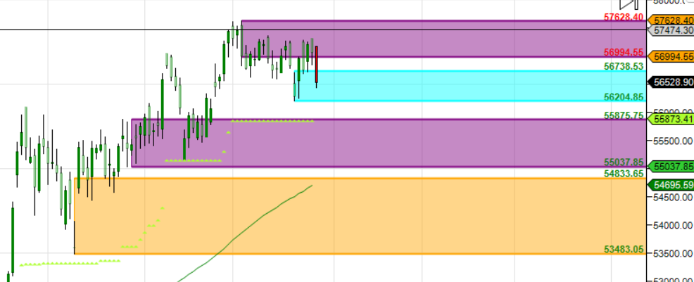 Bank Nifty has reacted from its PRZ zone of 57000 Unable to cross fall towards 55600.