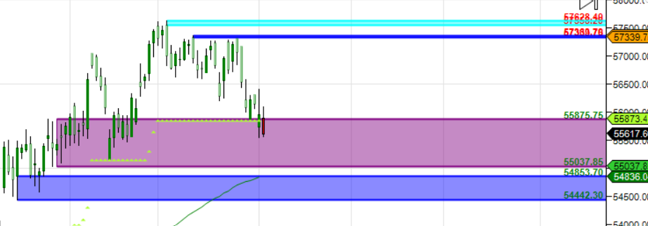 Bank Nifty has reacted from its PRZ zone of 57000 Unable to cross fall towards 55600.