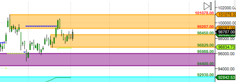 MCX GOLD Supply Demand Chart : Demand in range of 98450-98500 , Supply in range of 99287-99400