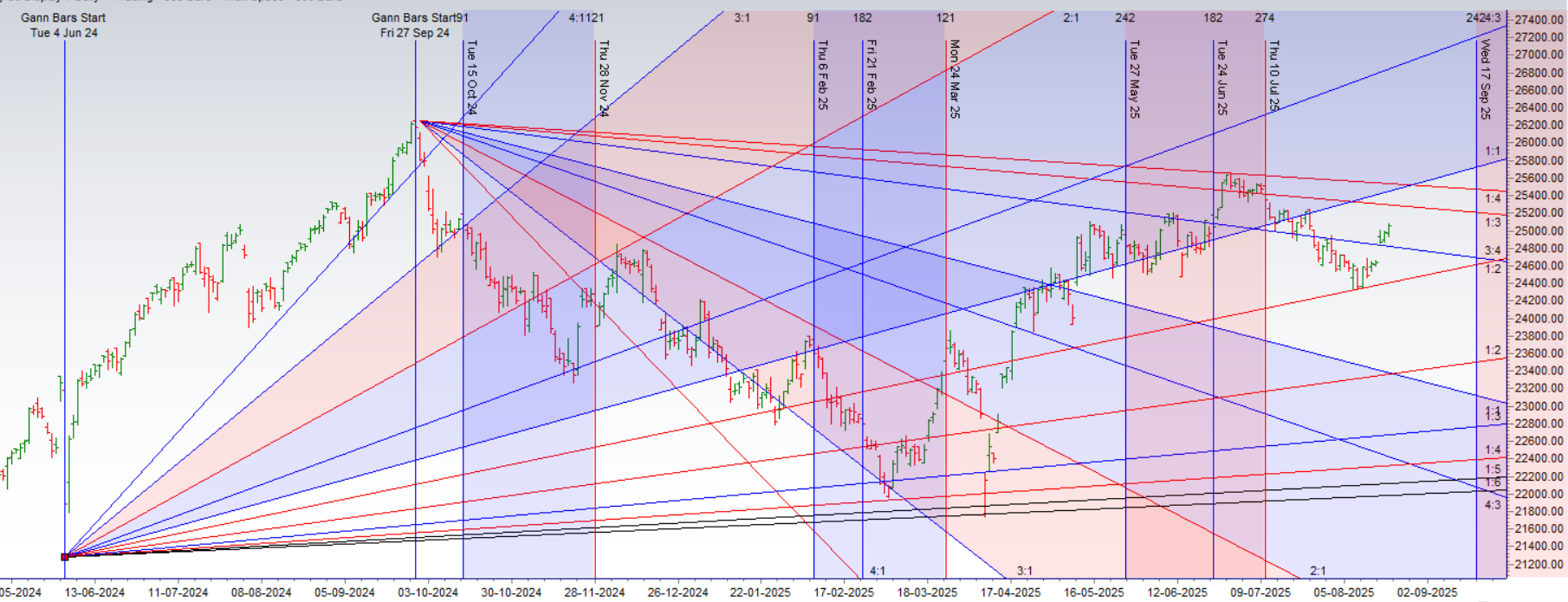 The Nifty has achieved a significant technical milestone by decisively closing above the 25,012 level, a key resistance marked by the recent Mercury Declination high. This bullish breakout, powered by strong momentum in the IT and FMCG sectors, signals that buyers have seized short-term control. However, this rally is built on a foundation of speculation—specifically, the market’s optimistic pricing-in of a potential GST rate cut. This makes the current strength exceptionally fragile, with major astrological dates on the horizon poised to act as a catalyst for significant volatility.