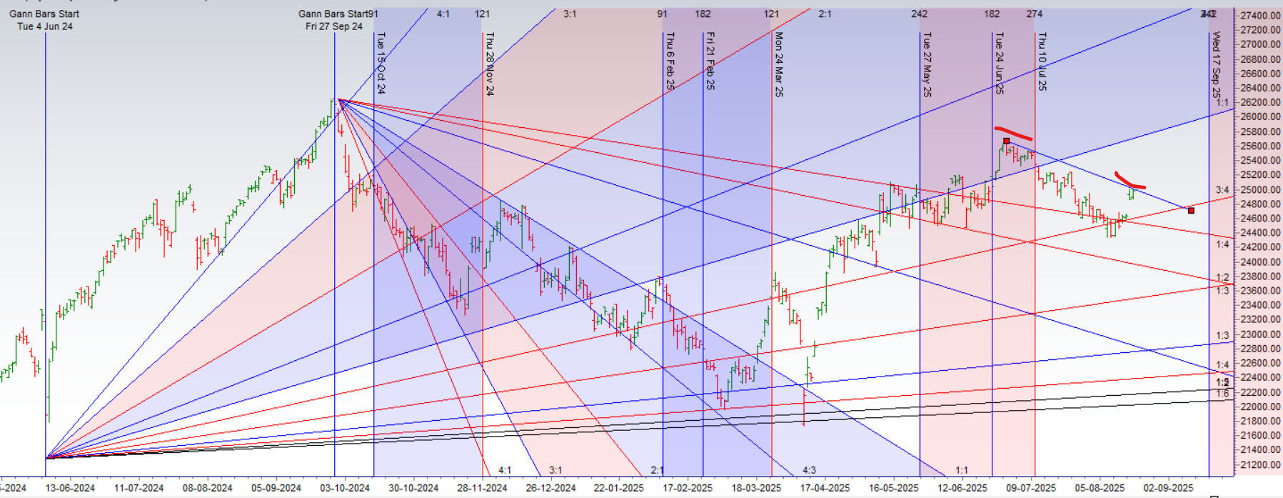 The Nifty is currently facing a moment of truth, pinned against a formidable confluence of technical and astrological resistance. The key level of 25000-25025 is acting as a powerful ceiling. The market’s inability to breach this level is now amplified by critical astro-timing events, suggesting that a decisive move is imminent. The failure of bulls to assert control here could quickly shift momentum, opening the door for bears to target the unfilled gap below.