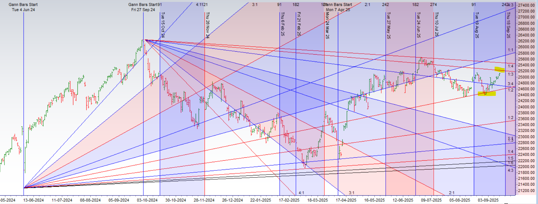 The forecast is therefore clear: as long as the Nifty fails to achieve a decisive close above the 25134 resistance, the path of least resistance will be downwards. The influence of the weekend’s time cycles is likely to act as a catalyst for a bearish reversal, pushing the price back towards the key support level of 24900. Traders must watch the 25134 level with extreme vigilance; a continued failure here will be a strong signal that the sellers are in control and a test of the lower end of the range is imminent.