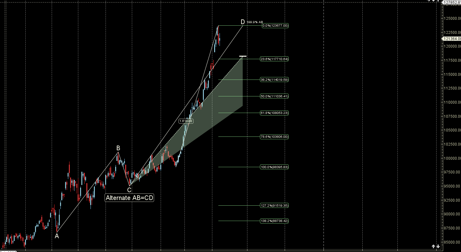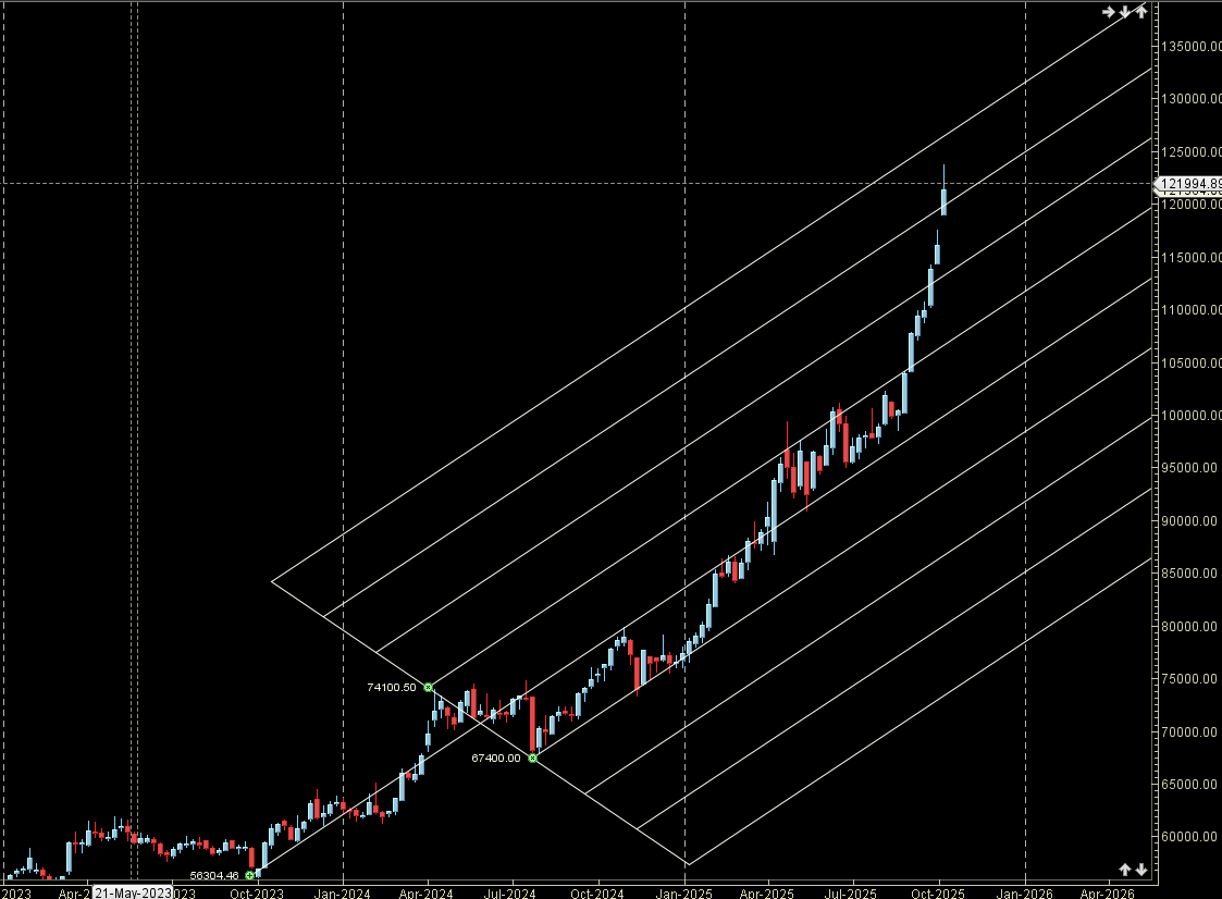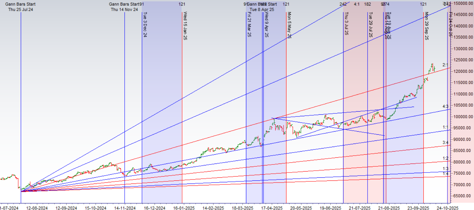 Gold is back to its 2×1 gann angle, break of 120000 can lead to fall towards 116K