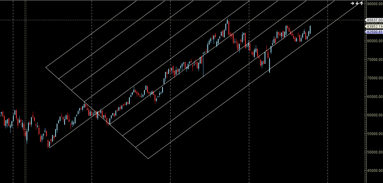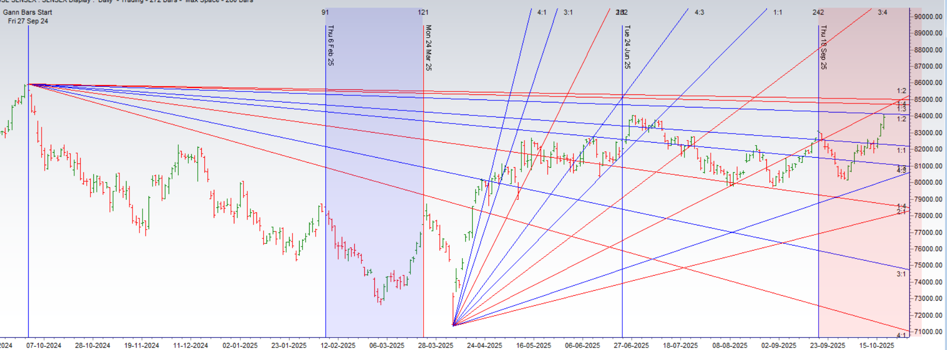 Sensex is heading to its 1×4 gann angle resistance zone.