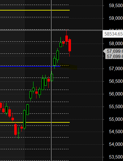 The logical and immediate downside target for this move is the psychologically and technically significant level of 57000, which is an important Gann level.
