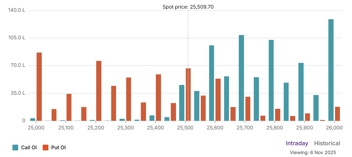 The Nifty options data for November 6, 2025, reveals a market under severe and overwhelming bearish pressure. An extremely low Put-Call Ratio (PCR) of 0.62 signifies a market heavily skewed by call writers, who are betting with immense size and conviction that any significant rally will fail. With the spot price languishing at 25,509.70, well below the Max Pain level of 25,600, the bears are not just in control; they are dictating the terms of engagement.