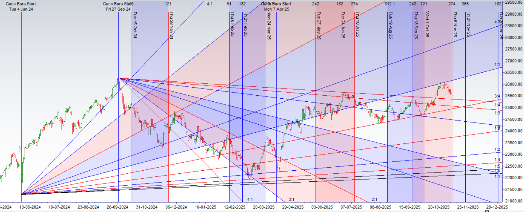 The market has moved with uncanny precision along the path forecast by our analysis. The potent confluence of Gann and astro cycles correctly identified the bearish pressure, leading to a perfect defense of the 25,700 resistance zone and pushing the Nifty down to the critical support at 25,500. The bears have successfully achieved their initial objective and have brought the market to the brink of its next major breakdown.