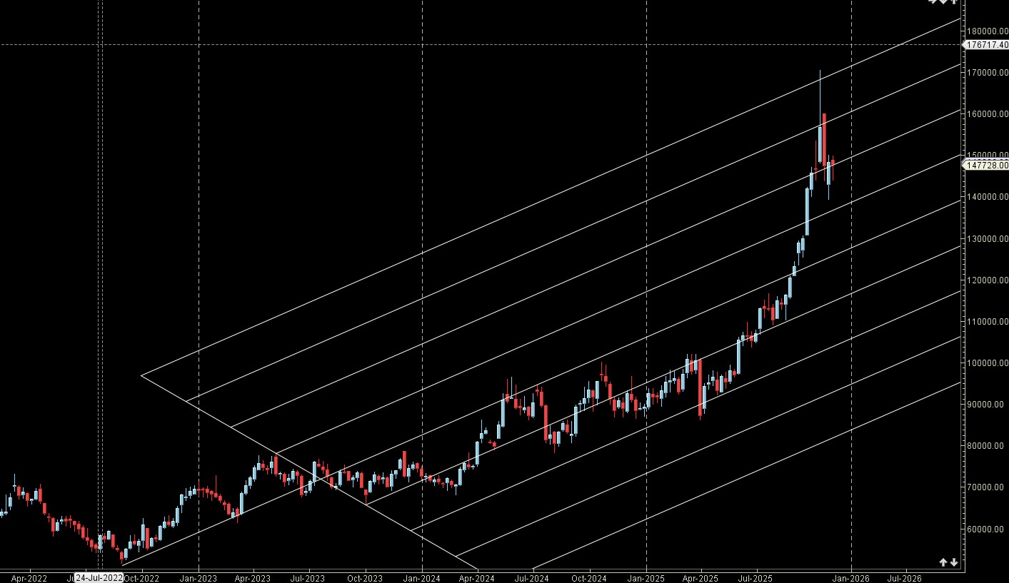 Silver has broken its 4×3 gann angle resistance zone break of 145 K can see a sharper pullback towards 140 K