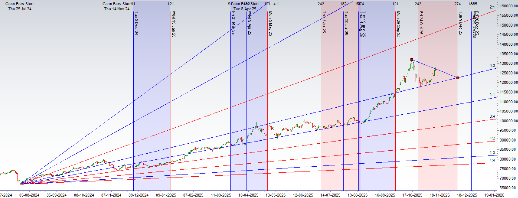 Gold is heading towards 120K at 1×1 gann angle and break of the same will lead to decline towards 117 K
