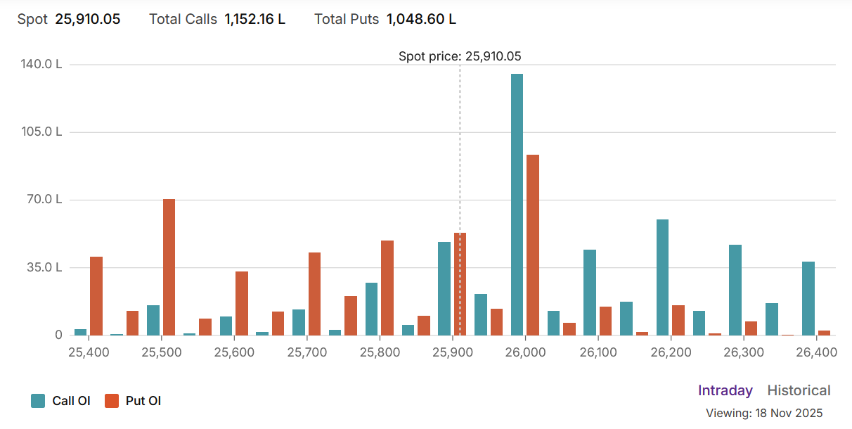 Major Support: The first significant floor of support is located at the 25,800 strike, where a substantial concentration of put writers has taken a stand.